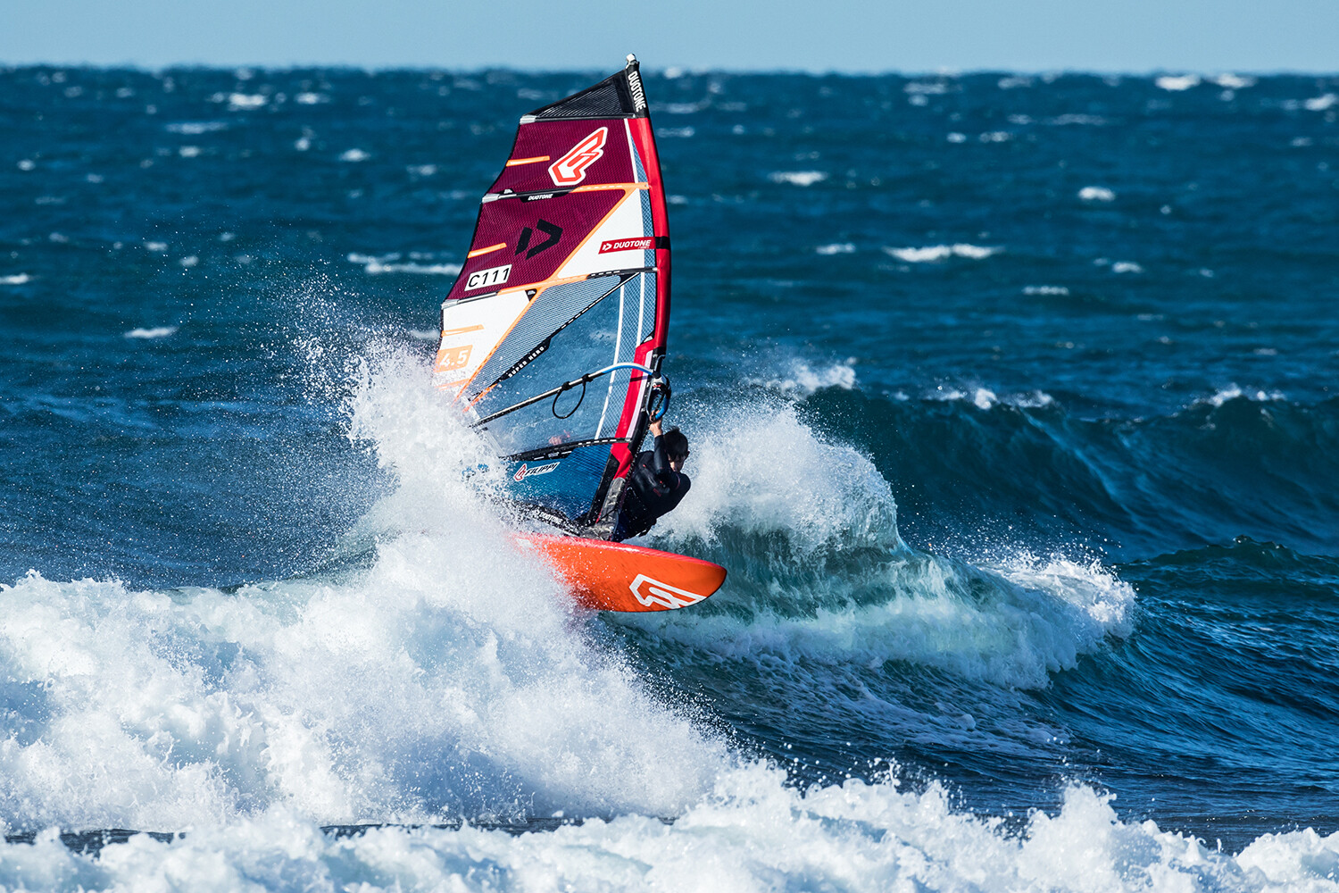 After four days of non-stop surfing, our team is asleep in the car on the way to Gruissan. When they wake up, the scenery they discover is very different from ‘Landes’, not the slightest wave on the horizon, instead 40 knots of completely offshore wind. The temperature has dropped and the car is showing 7 degrees Celsius on the temperature sensor. I have to play a very loud AC/DC track to motivate them to get out of the car! We spend the day freeriding and freestyling in challenging conditions at Mateille Lake and are really happy to finish the day with a hot chocolate and a catch up with Philippe Bru, Défi Wind organiser, before hitting the road again for new adventures!