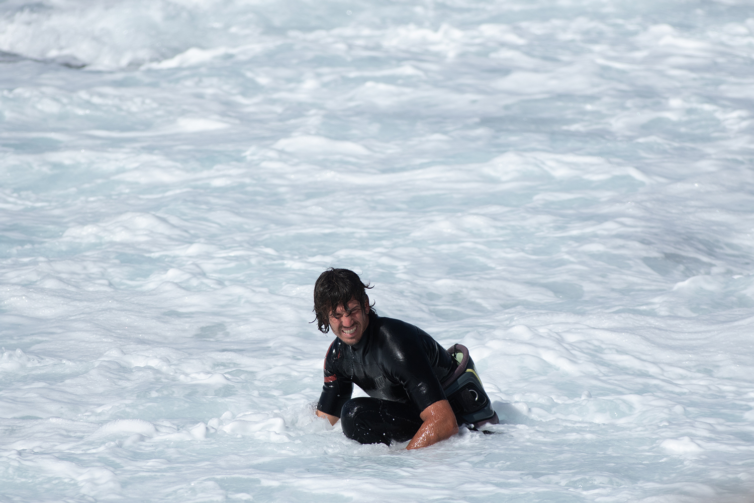 The wind started slowly dropping, so after riding a little redemption wave, I decided to look for one that could bring me in. You needed a wide one, which would hug the rock shelf and have some sort of power to carry you through to the inside. I saw Dieter grab one like this and at this point it was almost impossible to get waves anymore, the wind was so light! Again I had to get myself deep and hope a huge set wouldn’t come. Luckily I got a medium one, but the minute I passed the launching rocks it just fattened out and didn’t bring me all the way in. It left me about 50 metres to swim. I scratched pretty damn hard and finally managed to get washed into the beach on a huge set. One that I probably should’ve grabbed to come in on in the first place. Anyway, after getting slammed against the rocks a few times I was safely ashore but the chest high shore break destroyed my sail. I couldn’t believe it! After all the sketchy bits of the session, the easiest part was the only one that ended in gear damage!