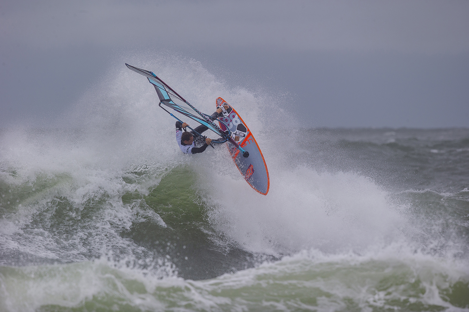 I am 1.78 m and 79 kg. In Sylt anything can happen. Every heat I had there was a big rain squall right before which totally killed the wind. I did not know whether to take small equipment or my big gear. During the rain squalls it was getting pretty windy and afterwards there could easily be next to nothing. You always have to go bigger than normal. In all the heats on the first day I was on a 94 litre board, which was ok with a 5.3. I just had no power to do anything. It was not a matter of the gear. How big can you go for a wave event? On the bolt onshore day it was windier so I took 4.7 and 5.0. I think my fins were 13 in the back and 9 in the front with a quad setup. The wind was so onshore and the inside is just whitewater foam. The wind hits the tent and bounces back to create a total no wind zone. Every time a sailor goes downwind, their wind is blocked. If you are lucky you make it out. Sometimes you have to go to the beach and walk or run back up. If you don’t clock up a high scoring wave and mess it up you can be done as you might not make it out. I did not feel it was fair, it was a matter of luck. Brawzinho had a great comeback to make it into second. I lost to Brawzino and just could not find the ramp to nail a double. He had a better advantage to me on the jumps, but I had better waves. It is what it is and there is nothing I can do.I was bummed I dropped some places on the overall rankings.
