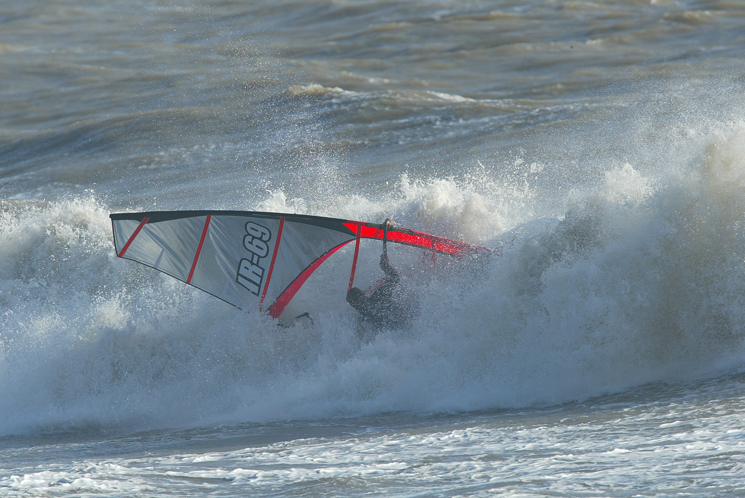 Niton really has the feel of a proper, hard core wave spot – the launch across the rocks, the swim out through the dead zone, the view downwind of nothing but more rocks and cliffs to catch you if it all goes wrong. This was a very special day. Sunshine, screaming side-shore wind, very big swell, stunning backdrop – it had the feel of a wintery Ho’okipa, except it was harder to get out. There was a lot more white water and some really meaty bowling sections to confront. The wind was chopping up the faces of the big outside sets, but it was down-the-line and jumping heaven. Everywhere you looked the likes of Skye Boy, Audsley, Mullet, Ross Williams and Andy Funnel were popping 20-30 foot off the deck.