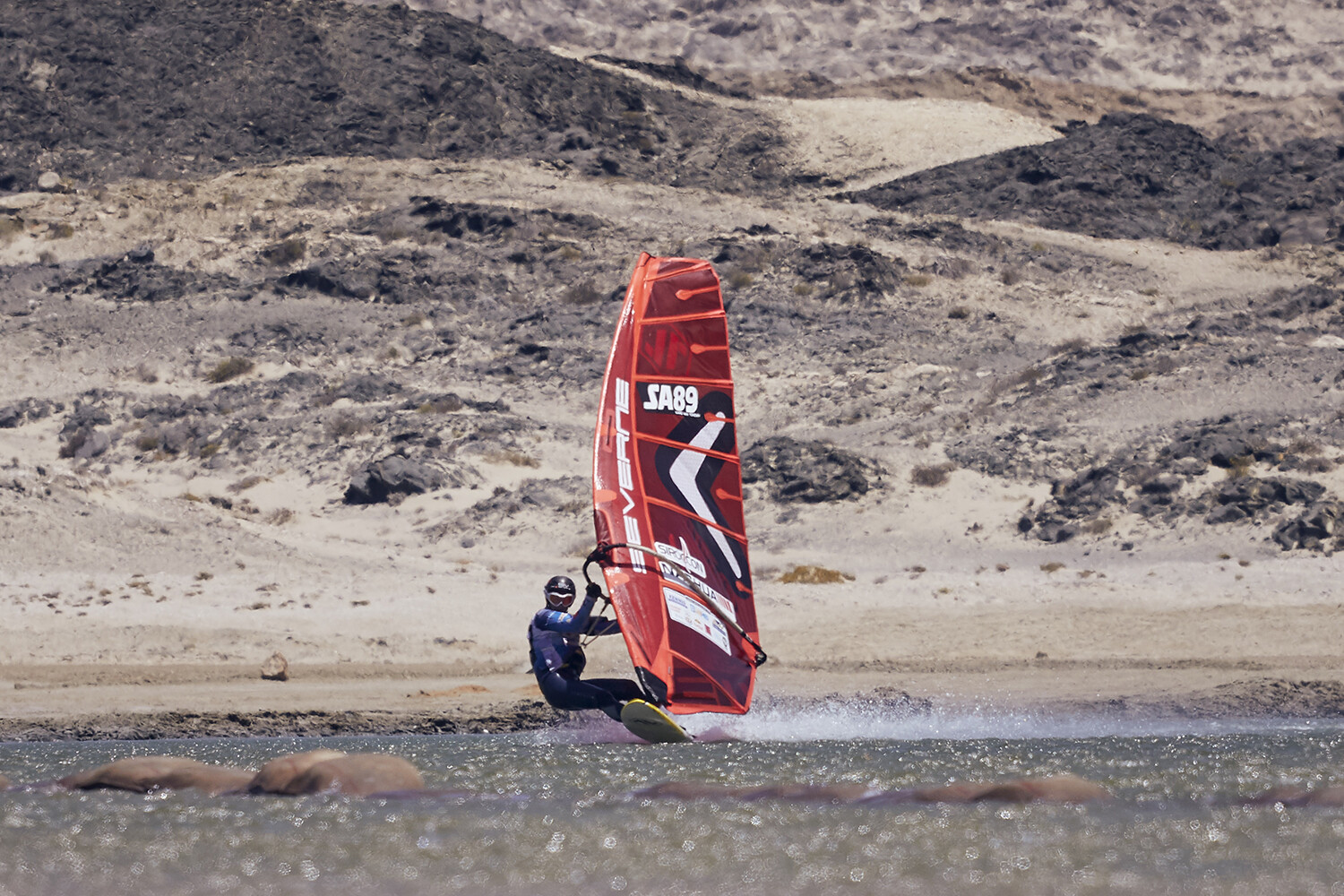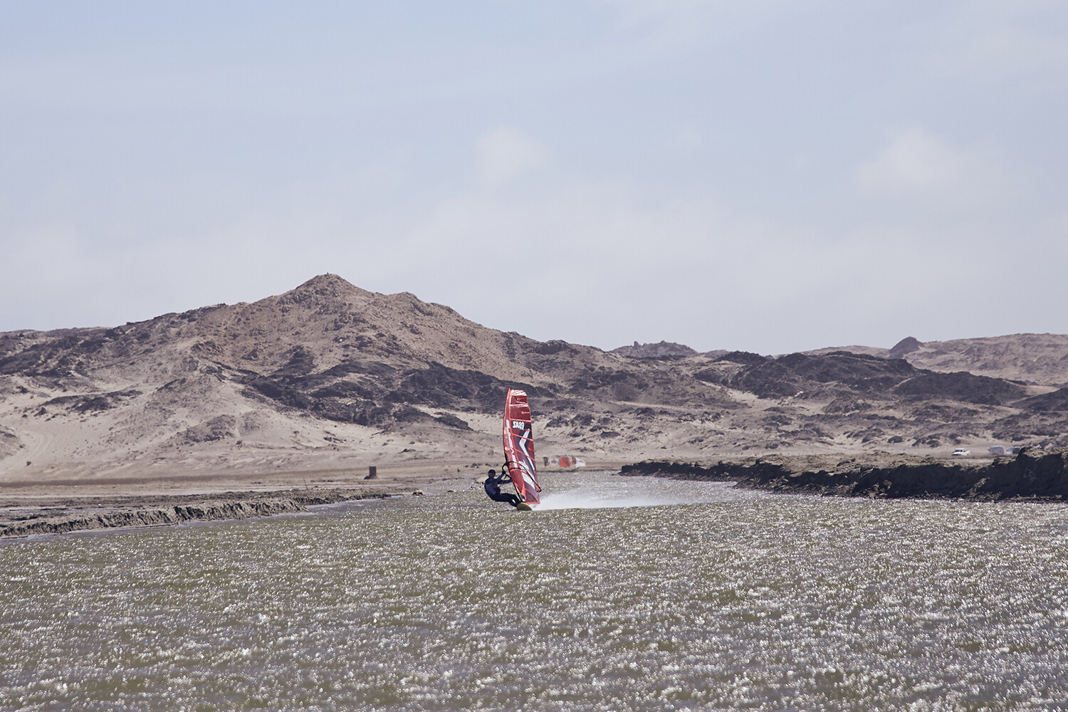 My first priority was to return in one piece and secondly, to improve my African speed record, even if only by half a knot. On day one I got into things very smoothly and was stoked that I managed to waterstart the smallest board I’ve ever sailed, a 43 litre AV speed board that was 37 cm wide. The waterstarts at Lüderitz can be one of the most difficult skills to master, but it is also the most important aspect that determines your average speed down the canal. A perfect start leads to a high entry speed that gives you enough momentum to maintain it through the lulls. There are two types of starts on the canal: ‘water starting’ and ‘jump starting’. Personally I prefer the ‘water start’, because, being very light, the wind can gradually lift my sail and I up and I have control over how much wind I allow under my sail at the right moment as I lift it up. When ‘jump starting’ in very strong winds the gust hits your sail full on and you go from zero to maximum power in the sail in split seconds. This is a lot of instant power to manage for someone my size and the risk of getting tossed right over the front is high. For the bigger guys, the ‘jump start’ is definitely the preferred method, because they can do a forward motion push before jumping on, creating momentum to the front that is just enough to carry them through all the motions of getting feet in the straps and hooking in without sinking and crashing their fins. However, when the wind gets really nuclear, even they prefer doing water starts. Whether ‘water starting’ or ‘jump starting’, the challenge is to be as light as possible on your feet, to prevent sinking in the lulls and hitting your fin on the bottom of the shallow canal.