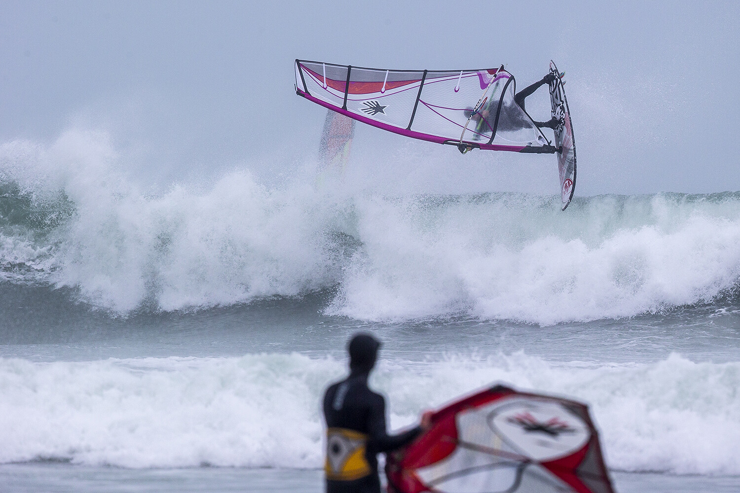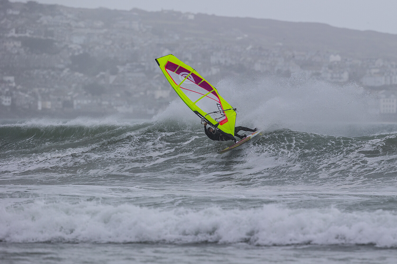 Bearing in mind this was a cold overcast Saturday in January with a pretty hefty 5 metre swell forecast, it was surprising to see over thirty guys out on the water by 2 p.m.! It was almost like being at Ho’okipa on a busy day in April, albeit without the sunshine, balmy temperatures of Hawaii and deep blue Pacific waves. On second thoughts, maybe not! With the conditions firing there was an abundance of carnage on the water, as sailors of all levels took on Mother Nature. I witnessed at least three guys dragging trashed kit up the beach after tussles with the bone crunching sets. Meanwhile the likes of Timo, Andy King, Steve King, Ian Black and Louis Morris were all bashing lips and taking plenty of beatings in the wild conditions.