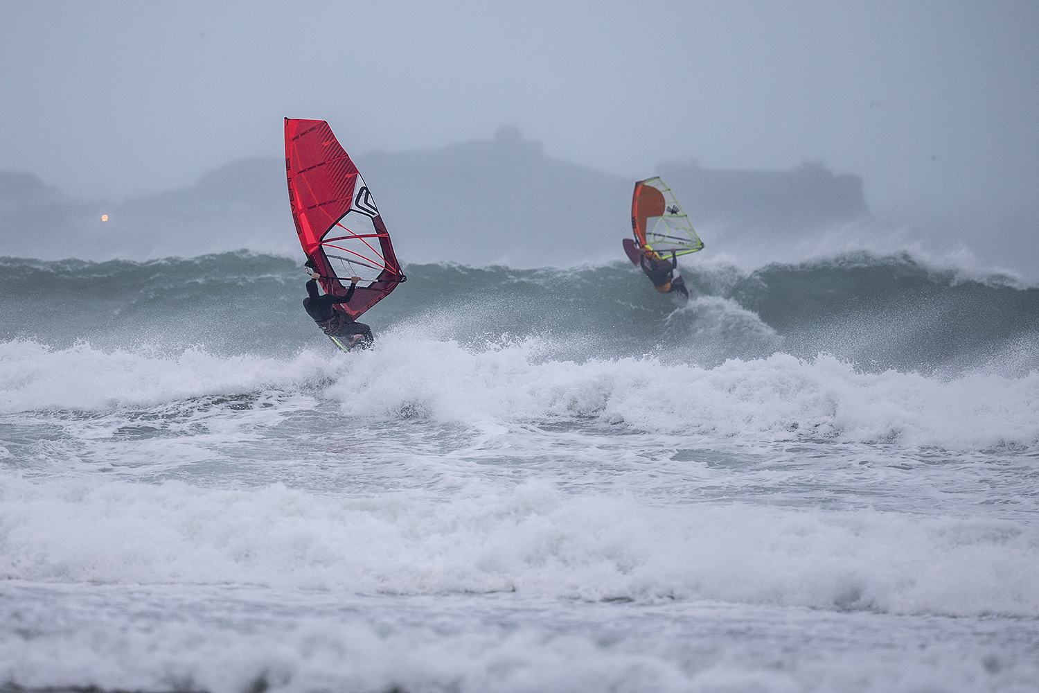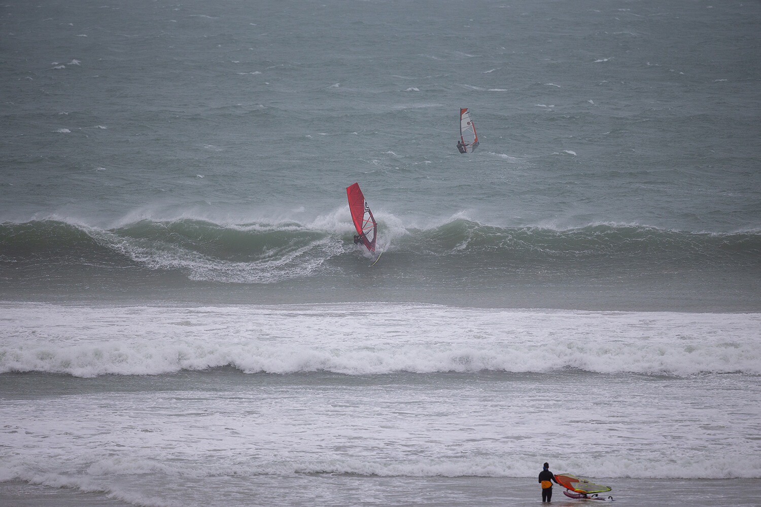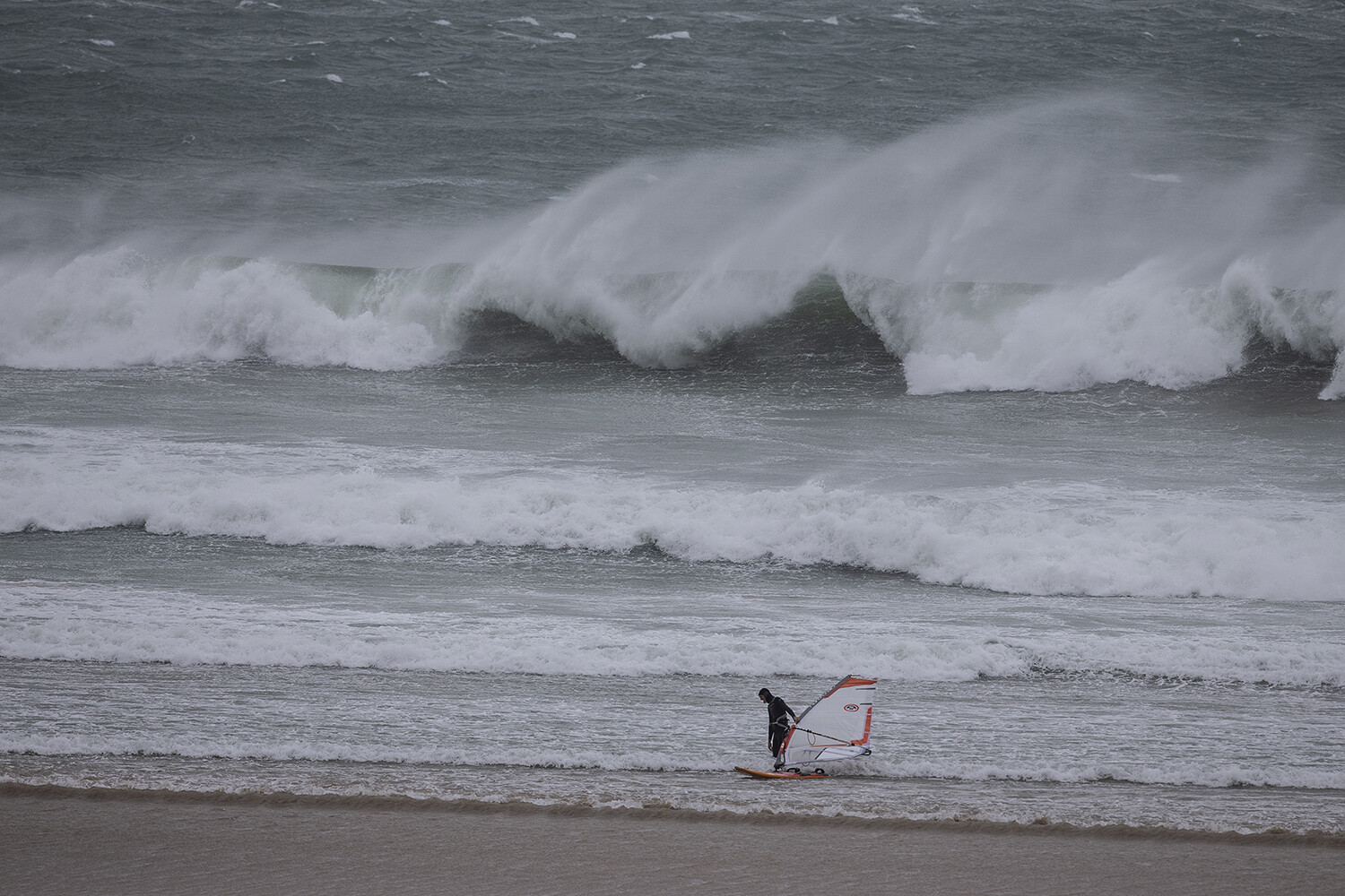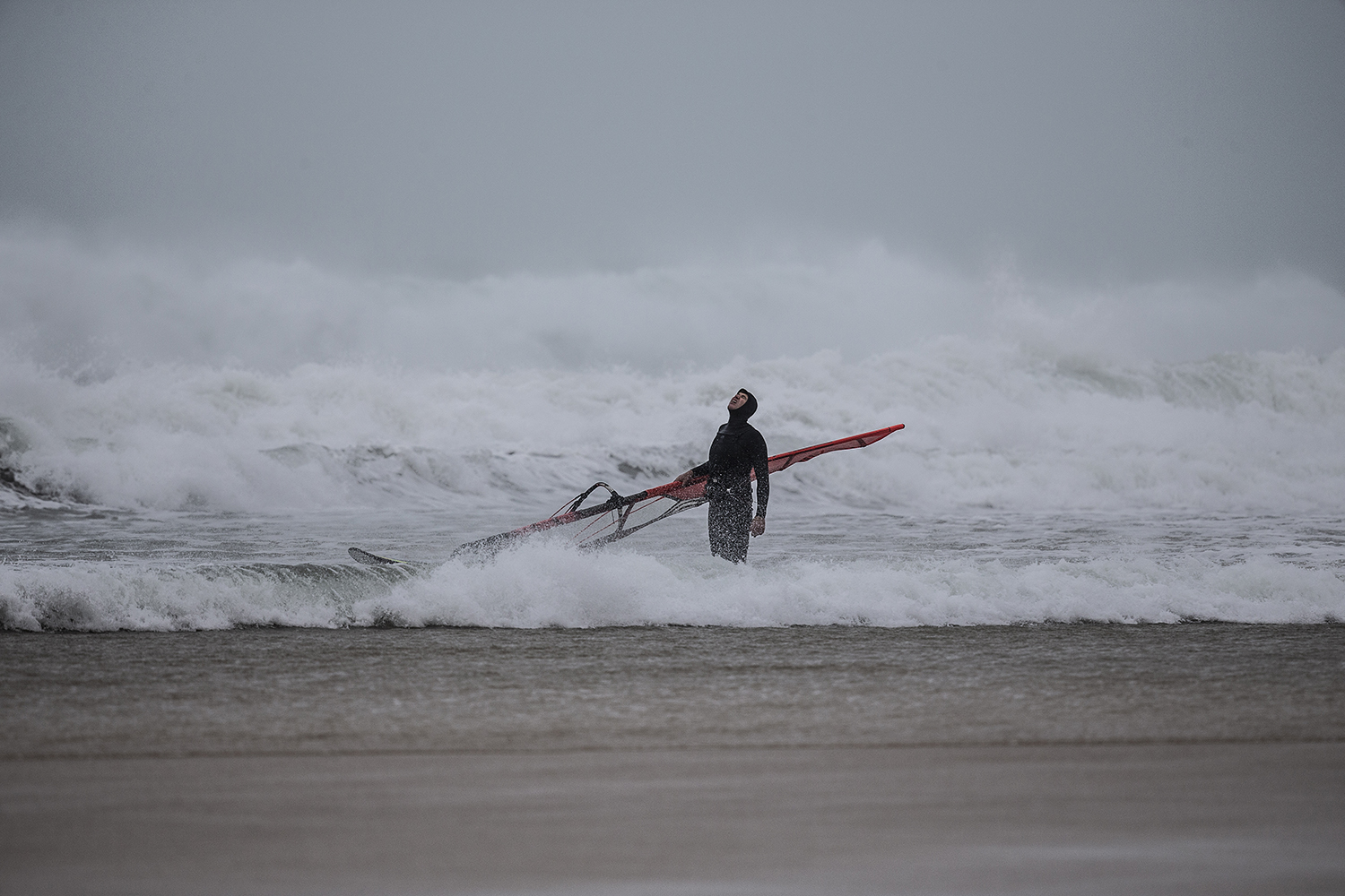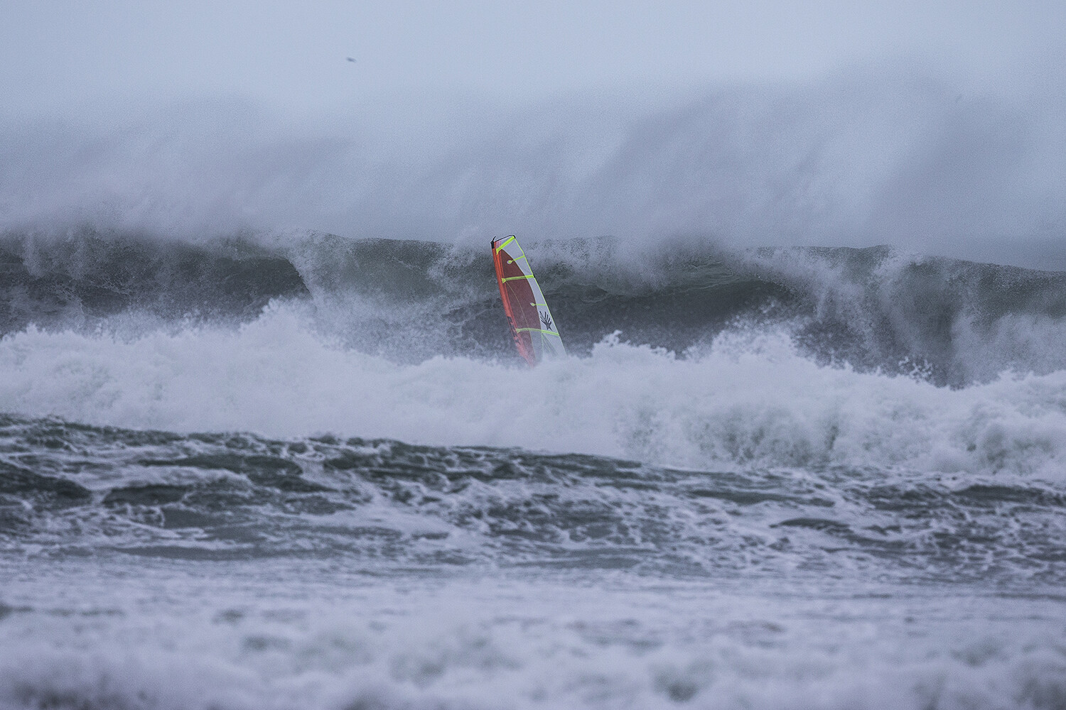 Down on the shoreline, I could barely stand up in the wind and driving rain. The only way to shoot was to stand with my back to the onslaught. I could feel that cold wintery drizzle working its way through my waterproof jacket, which was now apparently no longer capable of its duties. My T-shirt underneath was wringing wet, so were my joggers underneath my similarly incapable waterproof trousers. The crew were struggling out on the water. Duncan Coombs on a ragged old North 4.2m was actually hitting a few twelve o’clock vertical smacks, which was impressive! Thorpy was riding some bombs upwind, although those waves were difficult to shoot straight into the mist and rain. At one point the gusts were so strong I was huddled next to my tripod, using it as a lever to stop me being blown over. Swathes of sand were engulfing my wellington boots in ghostly trails blown by winds which must have been over 60 knots. After thirty minutes or so I jealously watched Timo retreat to his van, barely able to hang on to his rig as he marched slowly across the low tide sands. At least he was headed for a warm shower and a cosy business meeting with hot coffee and tasty chocolate snacks no doubt. Unable to cope anymore with the torrential deluge, step by step I retreated towards the SAS dune, hanging onto my gear for dear life as the winds went to storm force levels and the rain seemed to drive even harder. Looking towards St Ives the rain was so thick you could not see the headland. I had shot what I could of storm Brendan, but now the storm had got the better of me. I was physically not in a good way. Totally soaked to the skin, numb hands and all my gear was wet, humid and probably likely to break down due to this beating. Those that know me would probably say I thrive on misery. And in a weird way I was actually enjoying this. It was so bad it was good. I finally staggered to the top of the SAS dune and crumpled down in the shelter of a café that had closed down for winter. The boys were all finished with Brendan as well. There would be no more sessions today.
