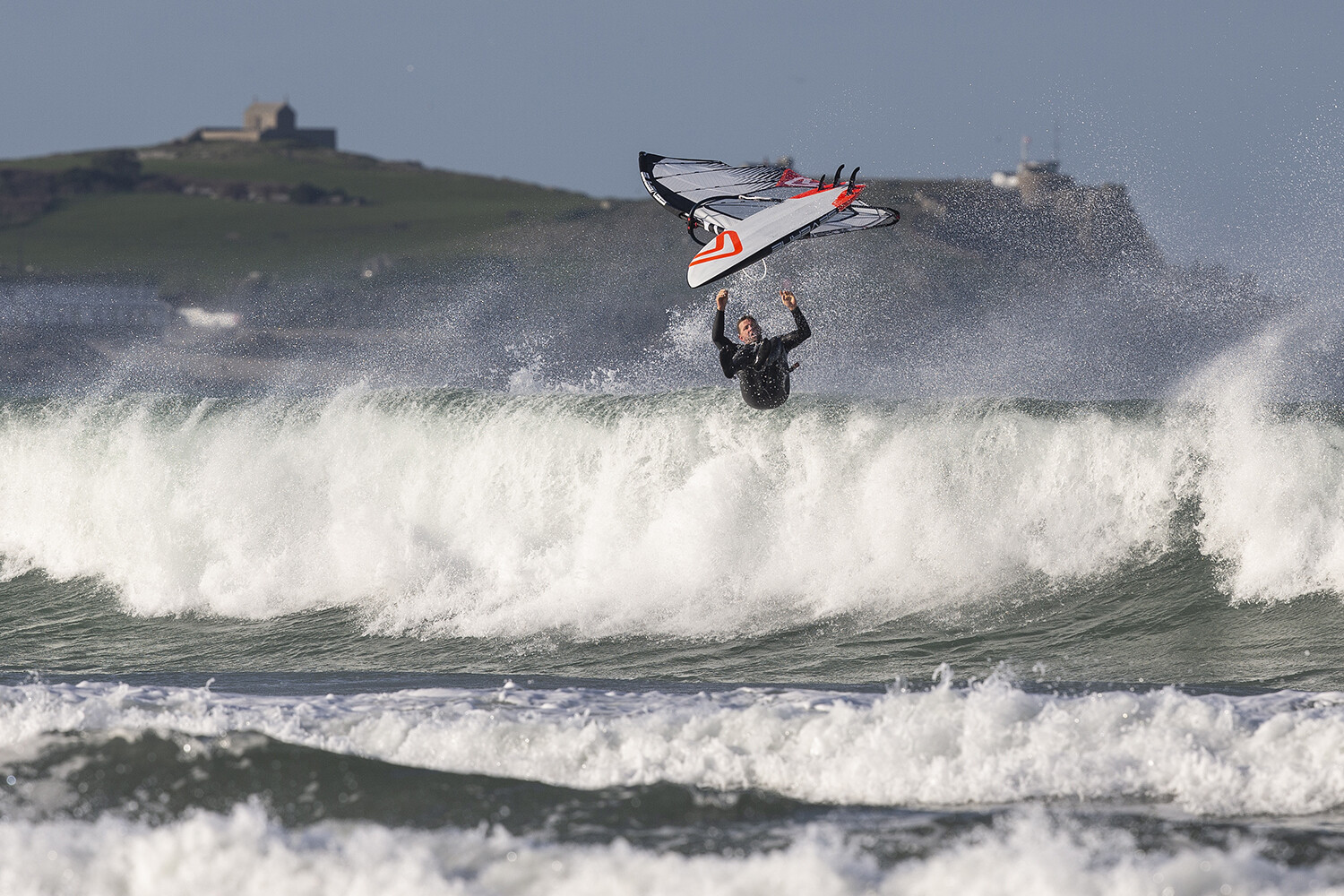 The next morning the rain had cleared but my head wasn’t so clear, again! Glorious blue skies greeted us along with light southwest winds. A quick check at the Bluff in the morning was enough to raise the excitement with some solid turquoise swell still grinding into the bay. We drove up to St Michael’s Mount to check Marazion, where the likes of Blacky, Andy Fawcett, Big Dave and the local crew were waiting on conditions for a jump session. The swell on the south coast was pumping and the wind was on the edge. The boys looked confident. Despite the locals, (who usually know best) being camped out at Mazza, I was drawn to heading back to the Bluff. It was a waiting game day, but I was not in the mood for waiting. By 12:30 we were back at the Bluff and the wind seemed to be filling in. It did not look epic, but after all that effort going forwards and backwards on the train, I was determined to come home with some worthy shots of storm Brendan. We had already seen shots of Kai Lenny scoring monster waves at Nazaré on a tow board and Traversa riding a huge slab in Galicia on Instagram, while we had endured heavy rain, nuclear winds and the brunt of storm Brendan in the worst possible way.