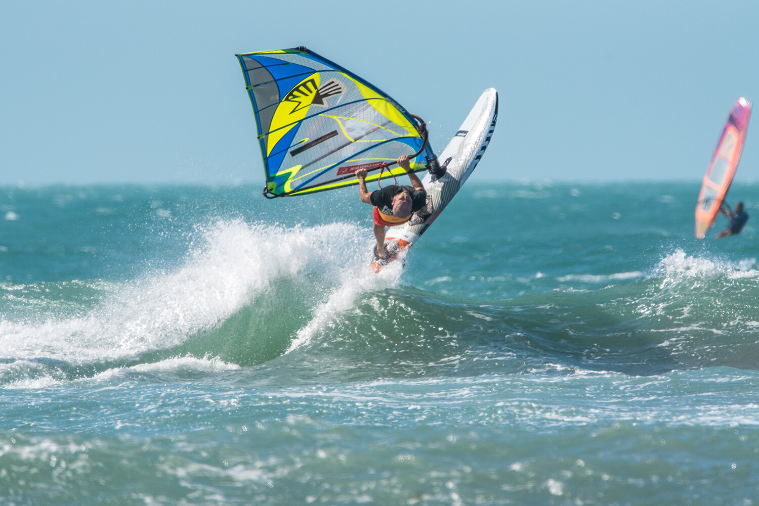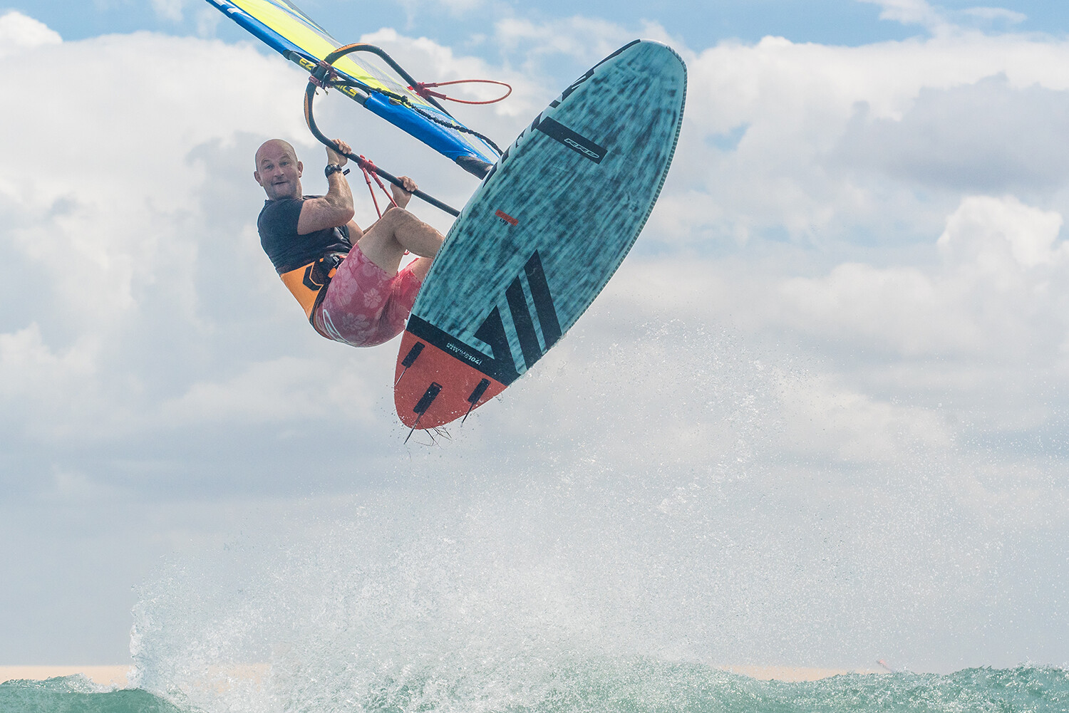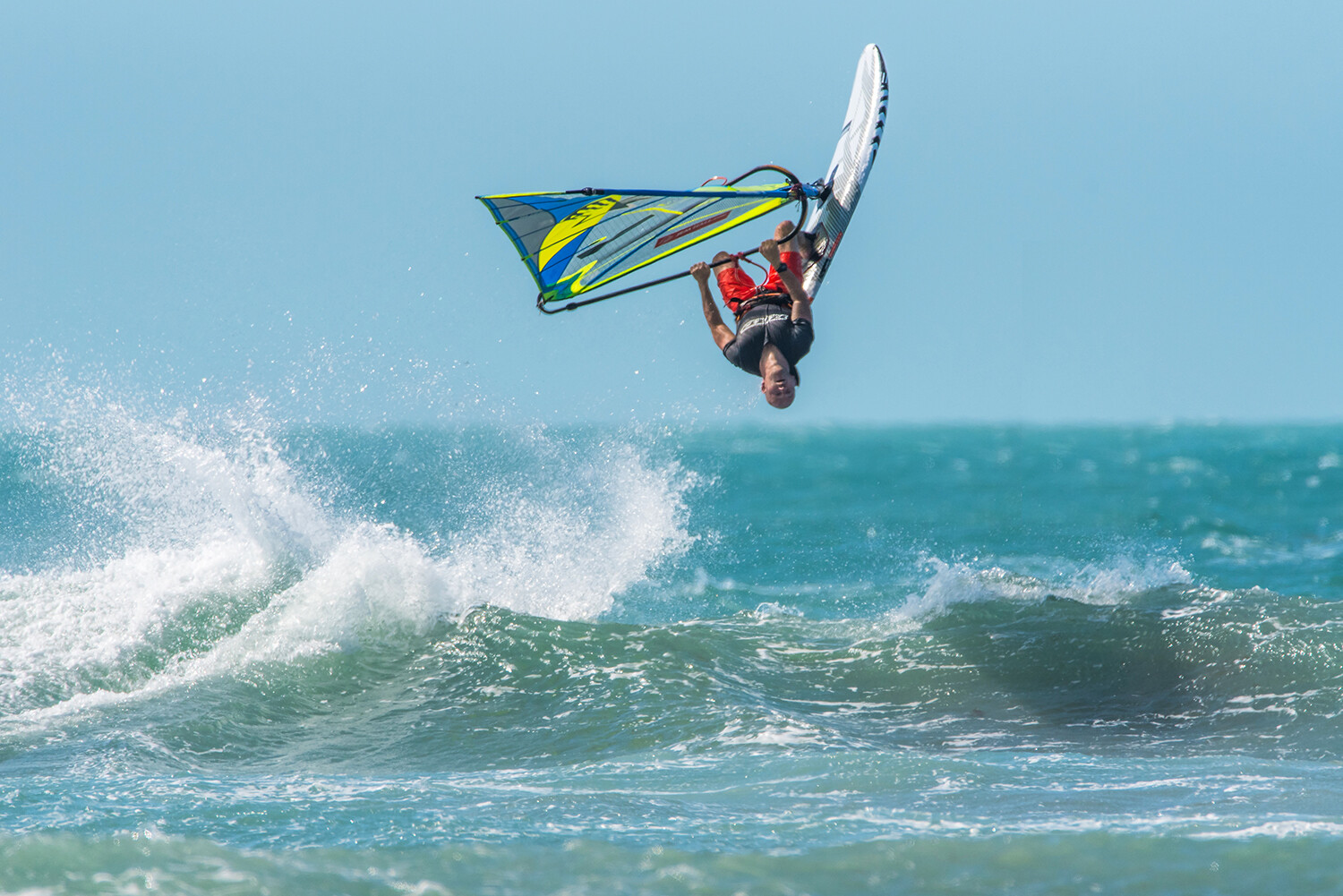 Throw your hips at the sail and keep your arms relatively straight. You need to really throw your head back and look back at the beach, aim to actually spot something you can see as this can really both help you and orientate you. Keep your eyes open as the sky flashes past you. Your legs should position the board in the air with the back leg pulling in and the front leg subtly pushing the nose off the wind to ensure the nose keeps across the wind –
