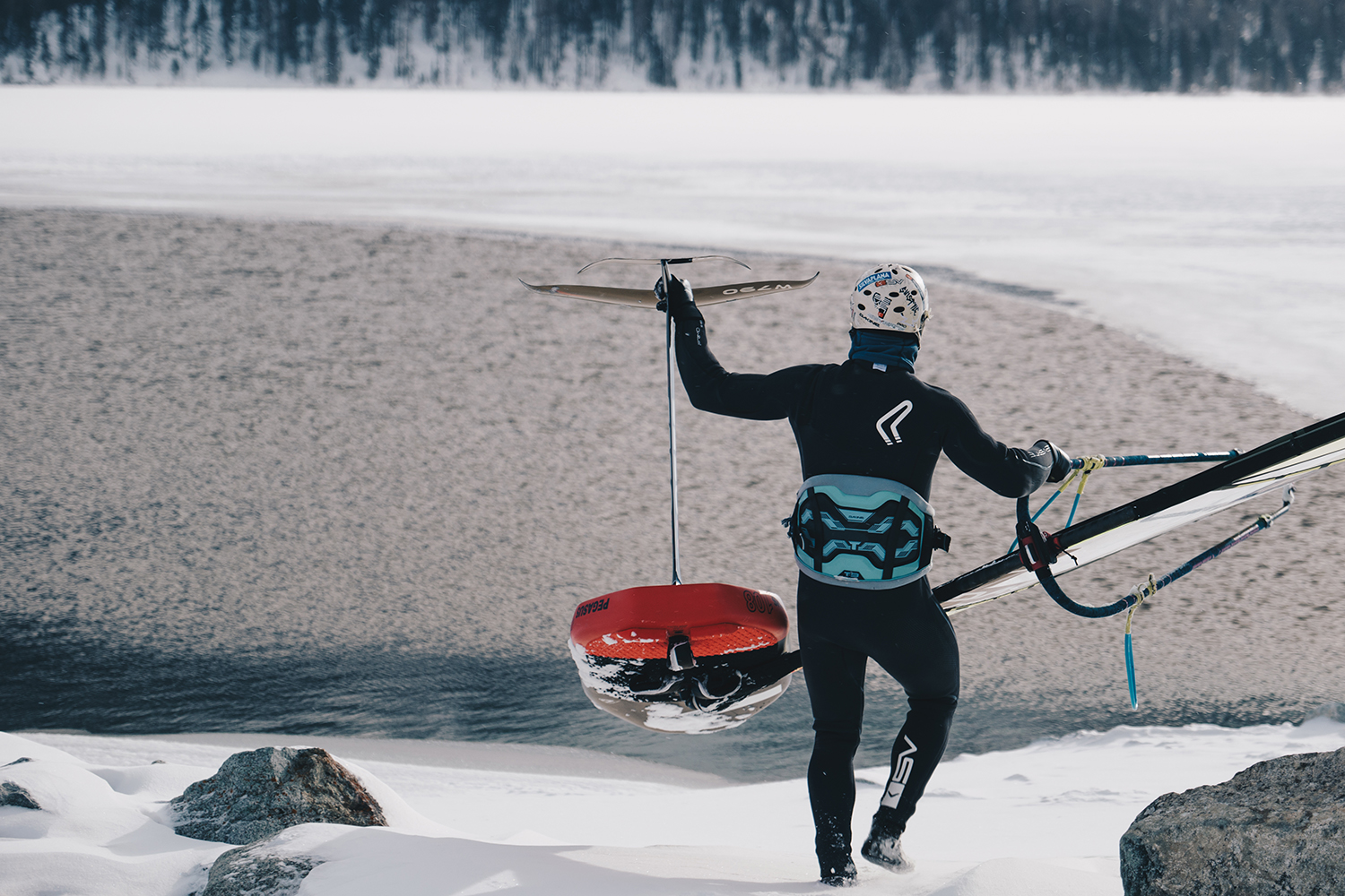 A few days later a stormy north wind started to blow, shutting down the ski lifts but giving me the green light to go sail. The mission was on! So I walked to the lake in my wetsuit and rigged my equipment full of excitement. The nature around the lake was mystically beautiful; this was going to be a session to remember one way or another! After only a few seconds on the water though I realized that this was not an easy task. The boom froze instantly and always wanted to slip through my hands. The sail became a stiff, heavy object; it felt almost impossible to pump it. On top of that, the water on the frozen lake was unreadable. The only way to see the gusts was by looking for blown along snow and by the time I had spotted the snow the gust had usually already pushed me abruptly into the water! One gust of wind threw me off my foil flight path and directly onto the ice, which I then fell through, ending up under the sail. It is truly a nightmare to swim under frozen water. Up to this point I never thought it would ever be too cold for a windsurfing session, but sailing in temperatures below zero degrees Celsius taught me a valuable lesson – I need a heated boom!