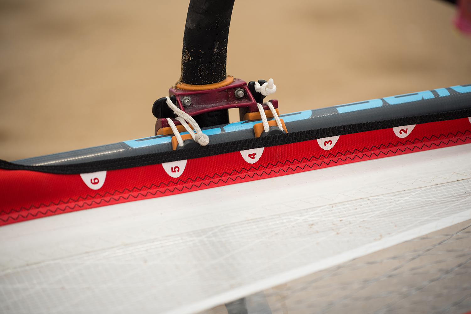 - Many booms have markings on them and so you can use the dots, and note these positions. One of my booms is 3.5 dots for smaller sails, 4 dots for medium sails and 5 dots for 6.5 / 7.0, as an example.