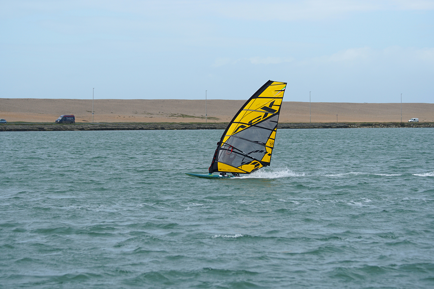 The AC-X bears the slogan ‘slalom no-cam’, providing race performance for “slalom speed seekers, who don’t like the hassle of cams.” It is available in two colour schemes for 2020 – the brand’s trademark black (code 823), or a more standout yellow (as tested here), carrying the code 7458. Another stated tweak for the new season is a remodelling of the profile, improving the speed of rotation and drive through the gybe. Rigged on a Black Prime 460 SDM, it is easy to rig, using the Quick Extension Tuning graphs along the foot of the sail to confirm the extension length required. Apply the downhaul and ‘the setting’ visual mark in the top panel provides guidance on the looseness required. There’s a good amount of curvature in the leading edge, but not as much as you might expect, the height of the AC-X (being the second tallest in the group), and its tapered outline giving it a high aspect appearance. Sporting tubed battens throughout, housed in lightweight anti-stretch x-ply pockets, the sail’s profile is decidedly flat at rest, with only the batten immediately under the boom cutout retaining any contact with the mast. And there is only one clew eyelet offered, said to be determined as the optimum position, to allow the leech to twist and open. It certainly displays a wealth of looseness right down to batten six! X-ply is employed in the foot and luff panel, with a new anti-UV transparent grey monofilm used in the window panel – fitting for a brand with penchant for anything stealth! The other additional panel worth mentioning is a thin slither of Dacron in the lower luff panel, but more of that when we discuss the on-water performance.