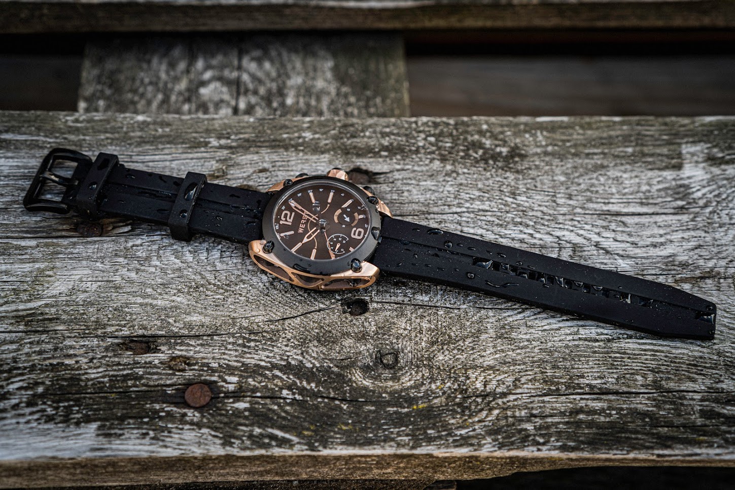 The watch is a chunky 89 g case without straps and is built with Swiss technology in 316L pure surgical stainless steel construction with anti-reflective, anti-scratch coated sapphire crystal glass, and a claimed water resistance of up to 100 metres, so no need to take it off when waterstarting thank goodness.