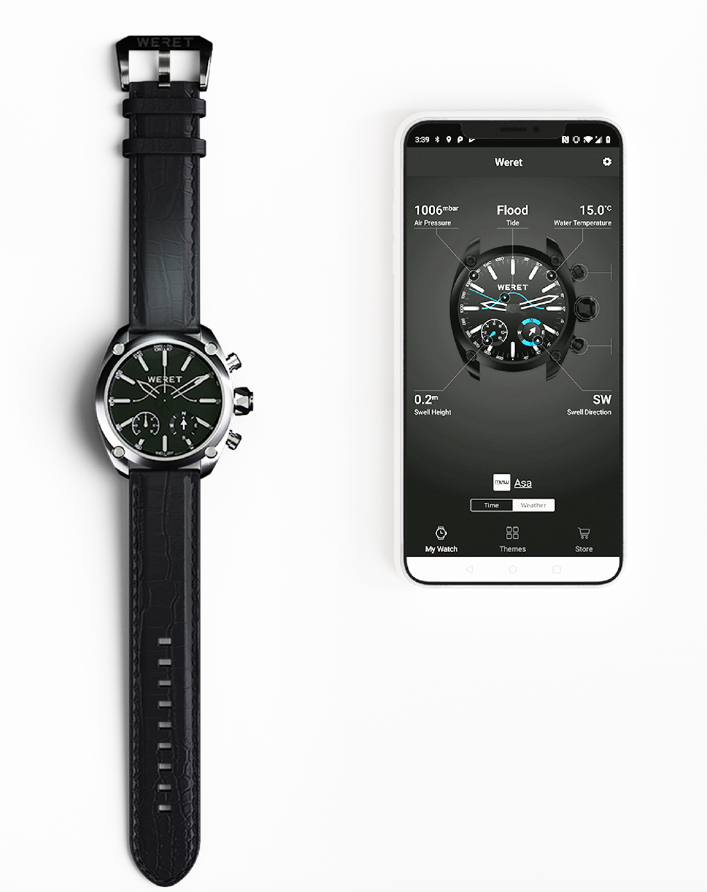A charging time of 2-3 hours will get you 3 months in normal use say ‘Weret’, so you can go on holiday between charges, maybe even two holidays if you’re really posh. The hands of the watch act as the Bluetooth antenna and once connected to your smartphone, and provided you have an internet connection, the time is automatically set and you get to choose what forecast data set you want displayed – ‘Wave’, ‘Wind’ or ‘Weather’, and from what beach you wish to be kept informed of. At the push of a button, the hands and dials will then toggle between displaying time or forecast, with the ‘Wind’ theme for instance displaying wind speed in Beaufort force, m/s or mph, as well as wind direction, tidal state, pressure and temperature. Other buttons on the watch can be configured for ‘Media control’, so press to play/pause and hold to skip a track on your smartphone, and a useful “Find my phone” feature which triggers a vibration or sound alert.